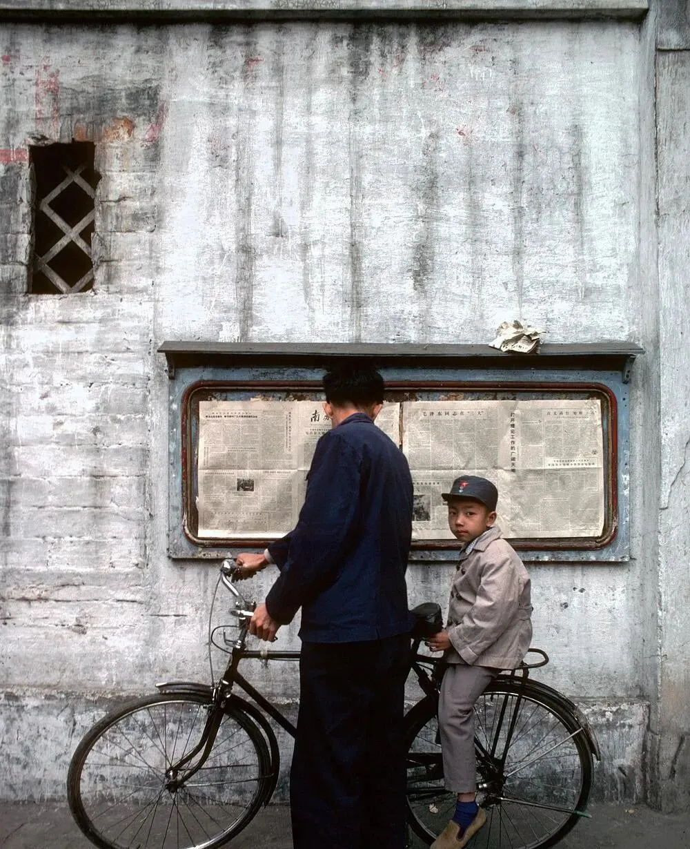 这个玻璃框里的叫墙报,黑铅字排得密密麻麻,男人一手扶着自行车把,孩子坐在后座上回头望我,眼睛黑亮,爸爸说那会儿消息都在墙上,谁家门口换新布告,邻里都来凑个热闹,现在信息在手机里,头一低,街上一圈人都不抬头了。