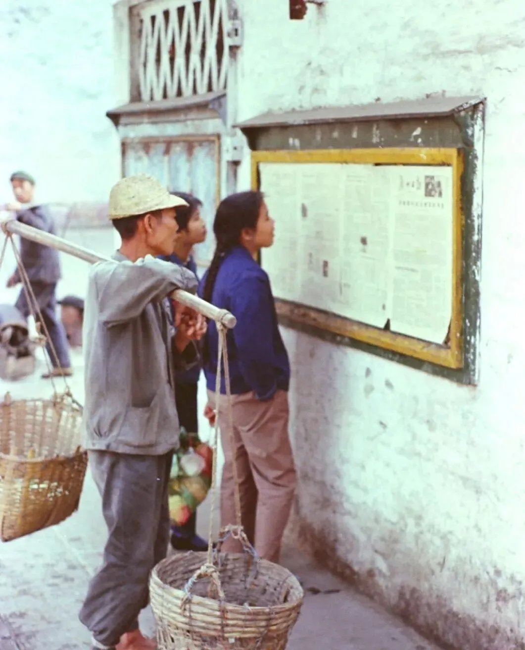 这张偏一角的草帽和竹担子,就是赶圩人的装备,两只竹篮子空空荡荡,在墙报前站半天,篮子像也在等,等一会儿再去码头买盐买酱,脚上草鞋磨得发白,不必多说,日子就是这么走出来的。