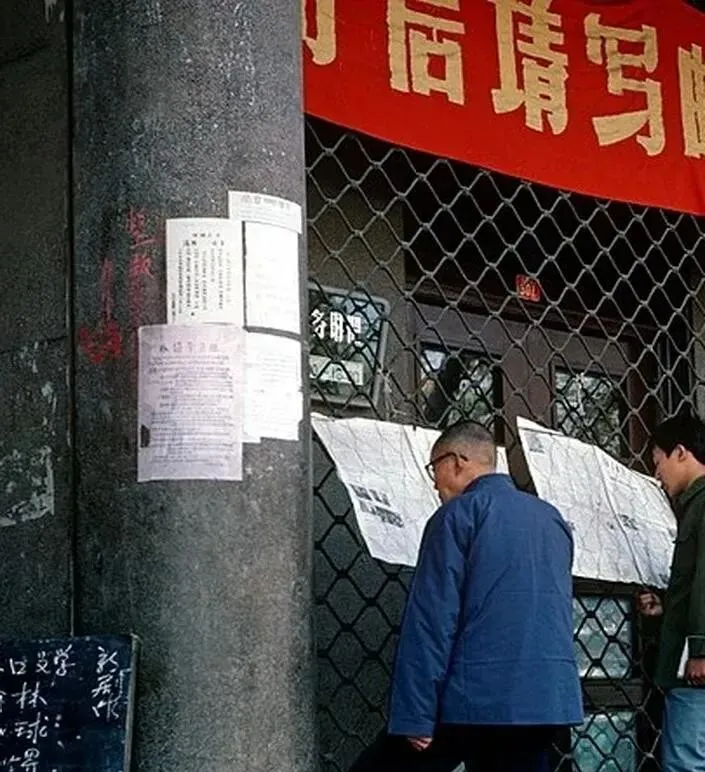这张柱子上贴的叫布告,墨印不匀,边角翘着毛,铁栅门半拉下来,风一吹哗啦响,两个人弓着背看得仔细,指头在纸上挪,像在掐算盘珠,爷爷说字能说明白事就行,不用花里胡哨,现在倒好,排版精致得像画册,事却常常说不明白。