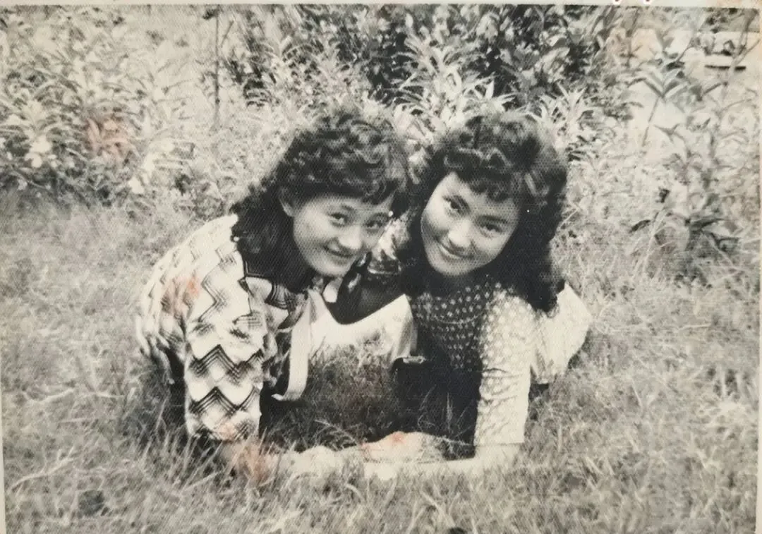 特别引人注目的是一对躺在草坪上的\"爆炸头\"姐妹花。她们大胆前卫的发型在当时的校园里绝对称得上是时尚标杆。一个戴着时髦的蛤蟆镜,一个扎着鲜艳的发带,两人亲密地靠在一起,对着镜头露出灿烂的笑容。这种充满个性的造型,展现了八十年代年轻人开始追求自我表达的时代特征。她们就像是校园里的时尚风向标,走到哪里都能成为焦点。