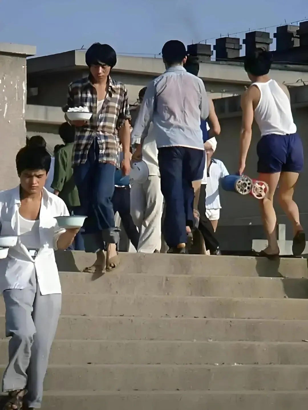 打饭和打热水是那时候大学生每天都要做的事情。由于座位有限,有的学生不愿意在食堂吃饭,于是就将饭打回宿舍。锅炉房里提供热水,中午或晚上学习结束后学生们会排队打水。