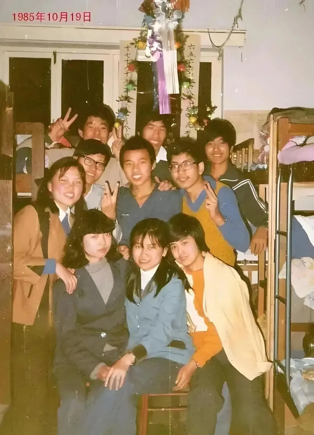 八十年代北京大学女生宿舍八人宿舍合影,女生们衣着靓丽,房间的布置也比较温馨。