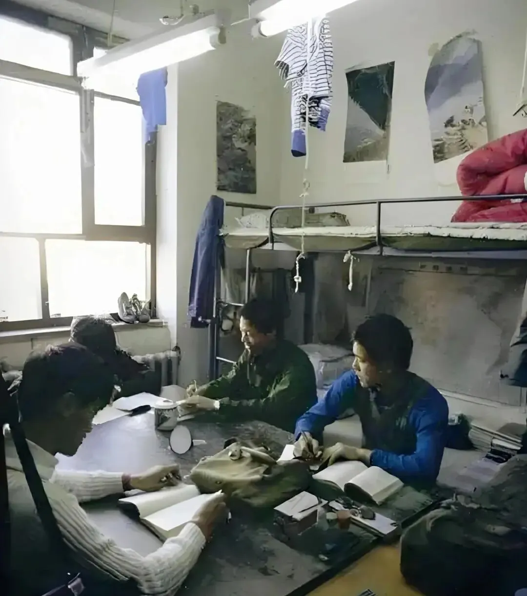 八十年代大学里的男宿舍,条件比较简陋,窗台上晾着运动鞋,床边还贴着世界地图。
