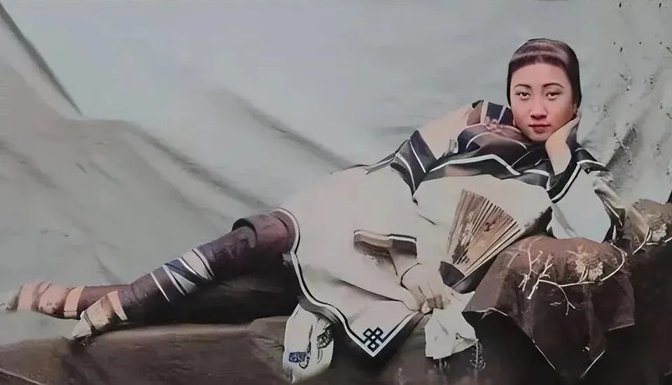 图中这位倚榻的女子手里拿着的是折扇,扇骨细密,面上似乎是水墨点染的山石纹,身上披的是滚边袍褂,黑白相间的镶条利索,绣线压得平整,这一身行头一坐下就显出体面两字,扇子轻摇,目光斜过来,像是在听旁边说书的段子呢。