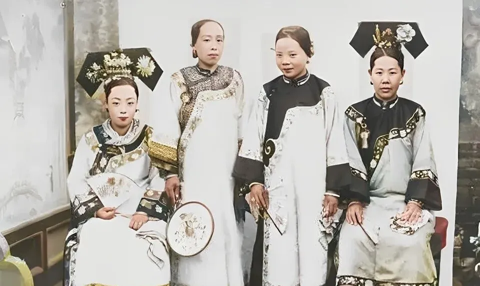 这四位穿的是满族女服,长袍外罩马褂,袖口里衬着亮色里子,头上两家伙板式的大翅子一看就费工夫,黑漆底上缀着金银小花,坐姿端着,扇面团扇各执一把,奶奶见着这种老像常说,规矩多啊,什么场合穿什么颜色都有讲究,现在可算是轻省了,逢年过节随手一件羽绒服就出门了。