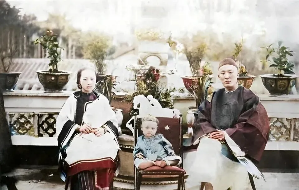 这一家三口坐在自家院子里,栏杆上花盆排得齐齐的,孩子穿着滚边小夹袄,脸蛋被风吹得泛红,桌上一只折扇压着,男子的袍褂绸面发光,女人披的披肩边线压住了褶,能看出是殷实人家,以前拍照可是大事,得挑个晴日,照相馆先生喊别眨眼,硬是憋出一脸严肃,现在手机咔咔一顿,笑也自然多了。