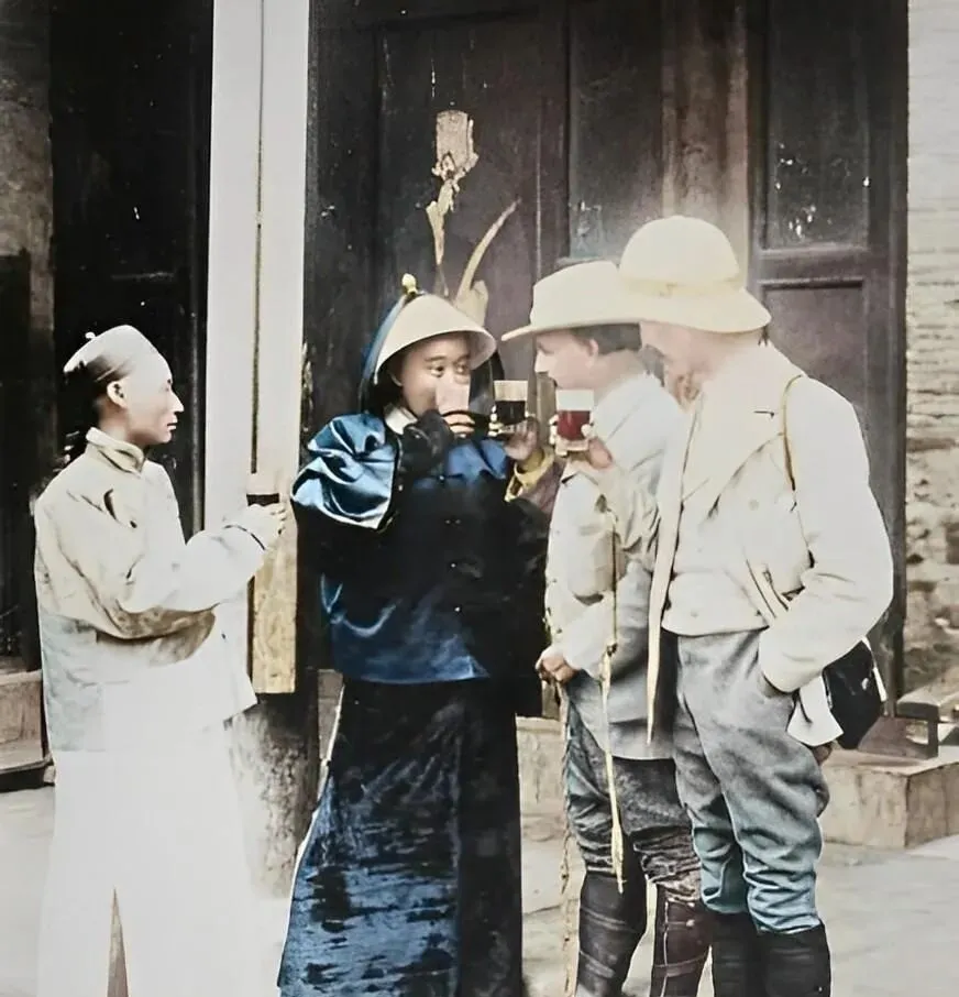 画面里几人举杯对饮,杯里像是啤酒一类的新鲜玩意儿,衣着一个是亮面袍褂加斗笠顶,旁边两位是浅色呢料帽子,站姿各异,倒也随意,老照片把那会儿的新旧交界拍得透亮,你来我往就是交流,喝的是什么不打紧,场面熟络起来事儿就好办。
