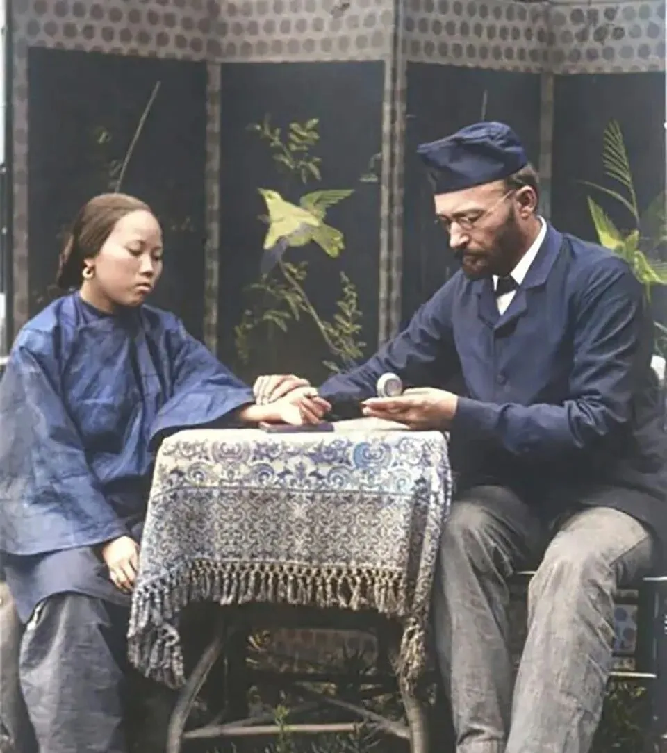 桌上铺的是流苏桌布,这位洋大夫指间夹着怀表,另一手按在姑娘脉口,眼睛盯着秒针数跳,姑娘垂着眼睫不说话,这套法子在当时算新鲜,外头的学问往里边钻,里边的方子也往外头走,现在咱们挂号看诊,电子屏滴一声就排上队,节奏全变了。