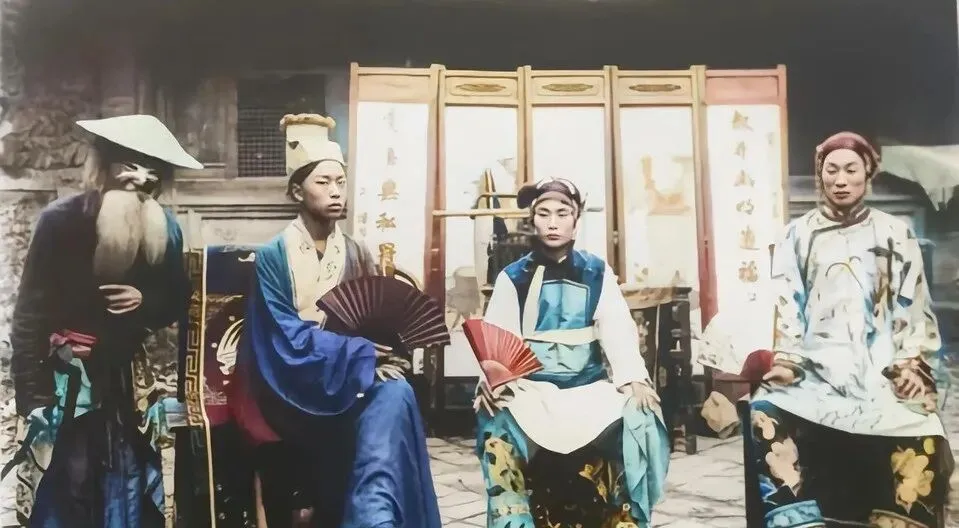 最后这张是戏班合影,四位坐定,扮相一水儿的工整,靠把椅、折扇、蟒袍、髯口,一样不缺,妆里勾线挺利,眼角挑起来就有劲,锣鼓一响,腔口一开,身段像水一样顺过去,那会儿看戏是大热闹,乡邻围个圈,瓜子泡茶齐活儿,现在看剧换到屏幕上,味儿是还在,热闹散到各家里去了。