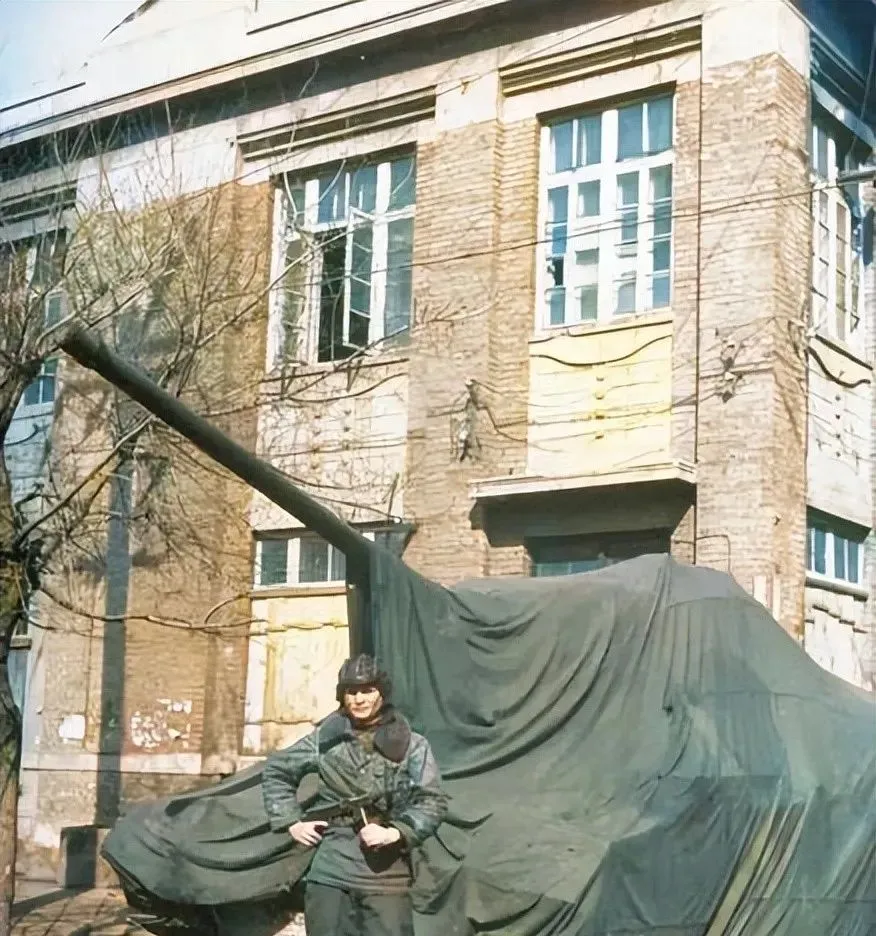 图中这门长长的炮管叫自走炮,身子用粗麻布严严实实罩着,铁履带压在碎石上,旁边的树杈都被蹭得光秃秃的,一位军人把枪别在腰间站岗,表情绷得很紧,爷爷说那会儿街上见到这种家伙,心里都咯噔一下,宁愿绕远路走也不敢多看一眼。