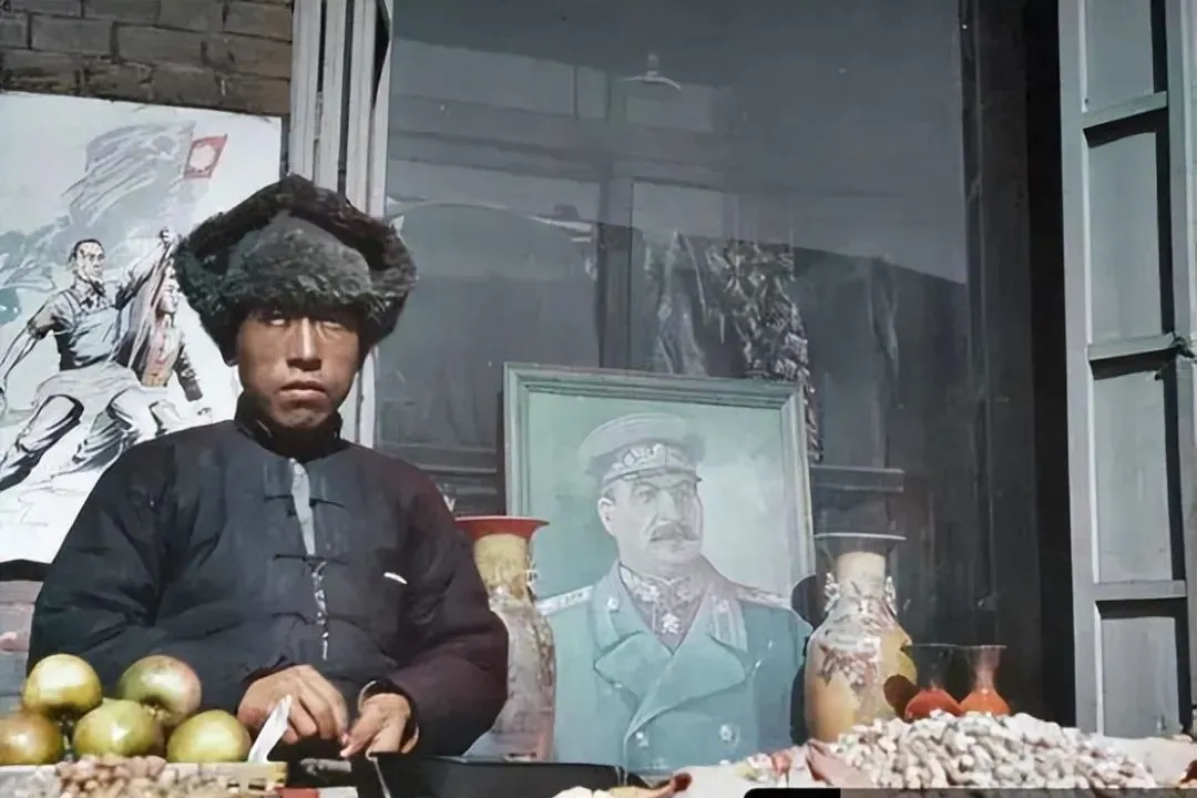 这个玻璃橱窗里立着一幅画像,摊主戴着大皮耳帽切菜,案板上苹果和花生零零散散摆着,橱里还塞着搪瓷花瓶和老旧的海报,他抬头的神情透着拘谨,奶奶说那时候开门做买卖,墙上挂啥不全由你说了算。