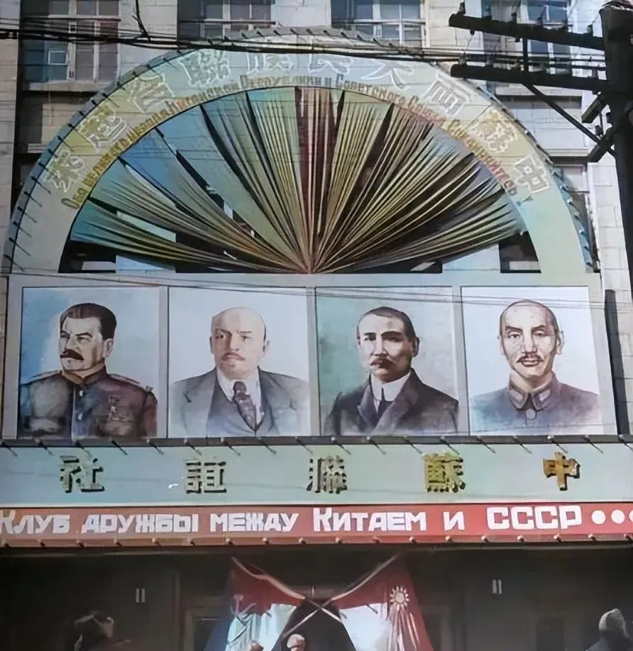 这张照片里挂着俄文横幅,字母一串串像冰凌子,下面绑着一幅彩像,绸带别在顶端,风一吹就哗啦哗啦响,门口的人脚步放得很轻,谁也不想惹眼。