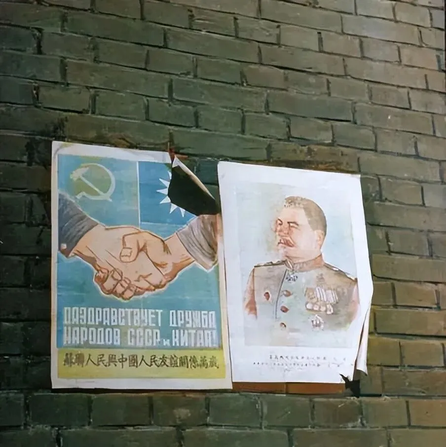 这张砖墙上的海报,左边一只手袖口带着锤镰标记,右边一只手旁边是蓝底白日,紧紧握在一起,旁边还贴着一张胸前挂满勋章的肖像,纸边卷起来像翻开的鱼鳞,风吹就啪啪作响。