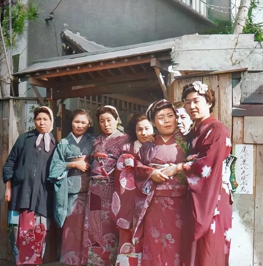 这排穿和服站在门口的是日本侨民妇女,纹样一朵一朵晃眼,脸上没什么表情,眼神却躲不开相机,门边立着木牌,墨字被雨打得糊开了边,听外婆讲,那时候他们常常变卖首饰换米面。