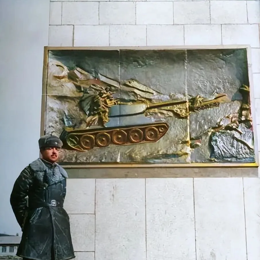 墙上的这块浮雕做得可真费料,坦克履带一节节凸出来,金色的光打在上面,像刚擦过蜡,前头的士兵把手插在皮大衣口袋里,站得笔直,眼睛往远处撇着,像在等换岗。