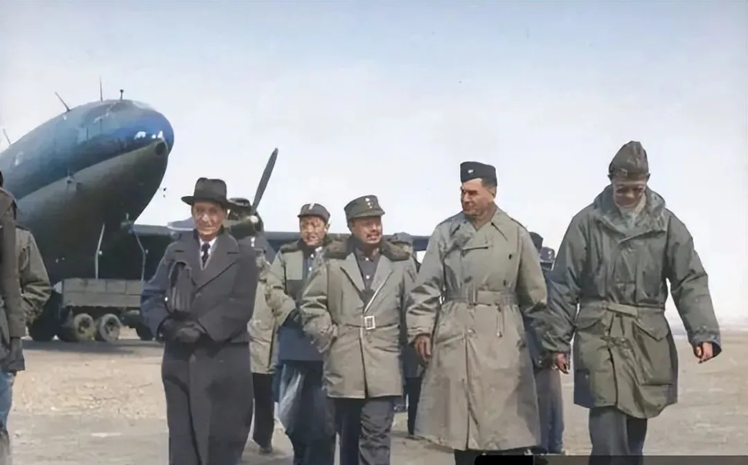这幅里头停着一架双发运输机,几个穿呢大衣和军大衣的人边走边说,脚底下是冻得硬邦邦的跑道,军帽檐子压得低,风刮在脸上也不眨眼,旁边勤务兵拎着工具走得很快,谁都知道这趟行程不一般。