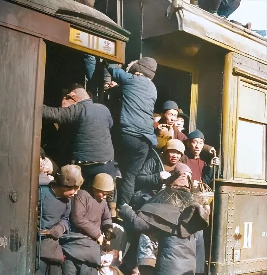 这是车门口的情景,人全挤成了一团,挂门把手的,扒窗框的,篮子从人头顶传来传去,车厢里的人喊“慢点慢点”,外头的人回“再挪挪再挪挪”,那阵子交通断断续续的,能挤上去就是运气。