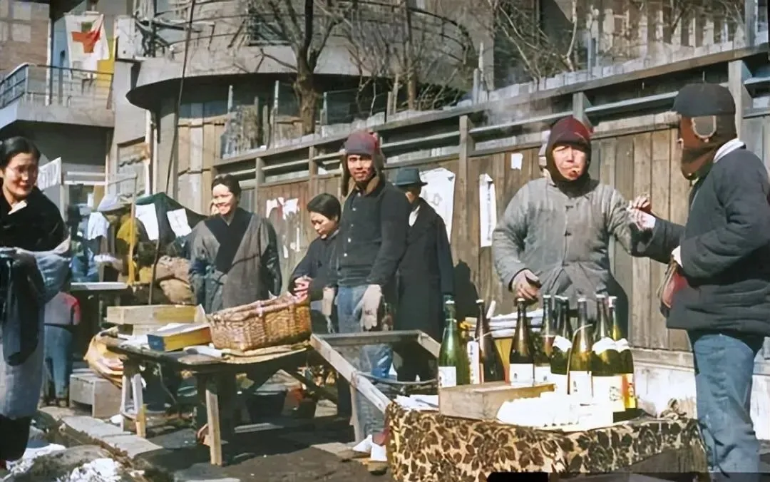 最后这一排地摊摆着玻璃酒瓶和旧货,桌面铺着花呢布,卖家叼着烟和人划拉手指头,旁边的妇女笑着还价,地上有半融的雪水,鞋底印子一溜串,那时候没什么正规的市集,大家把家伙什儿摊出来换点现钱,也好撑到下一顿。