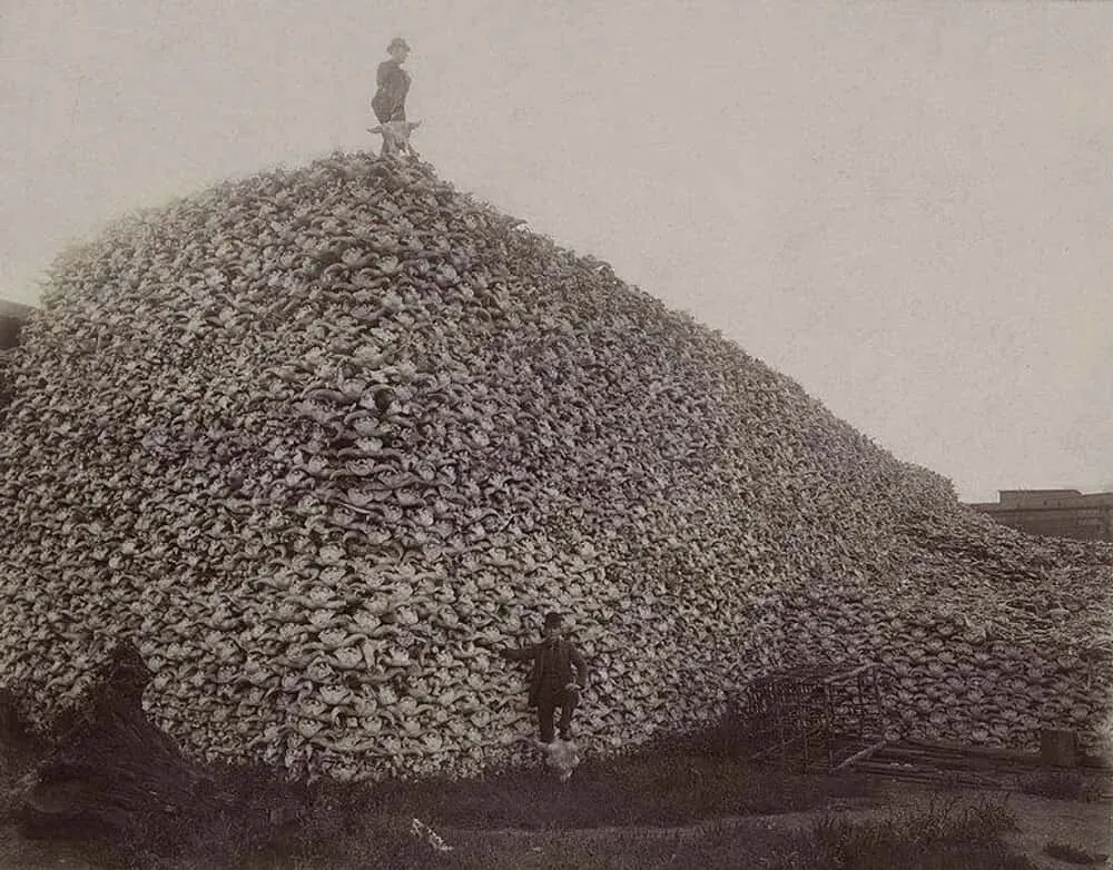 庞大的头骨数量,既见证了北美野牛曾经的繁盛,也揭露了它们近乎灭绝的悲剧。19 世纪初,全美野牛数量多达 3000 万至 5000 万头;到 19 世纪 80 年代,仅剩数千头;1902 年,全美野牛数量已不足 100 头。