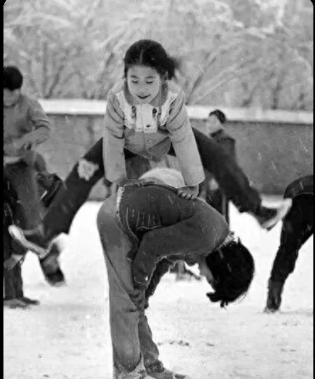 跳山羊,一个弯背,一个跳,有腿长的女同学能连跳好几个呢!