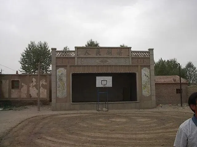 可以看出舞台的下方是一个篮球场,土窝窝。2001年的时候,乡镇隆重举行了庆国庆活动。有各单位之间的篮球比赛、文艺活动、拔河比赛等,确实热闹了一阵子。