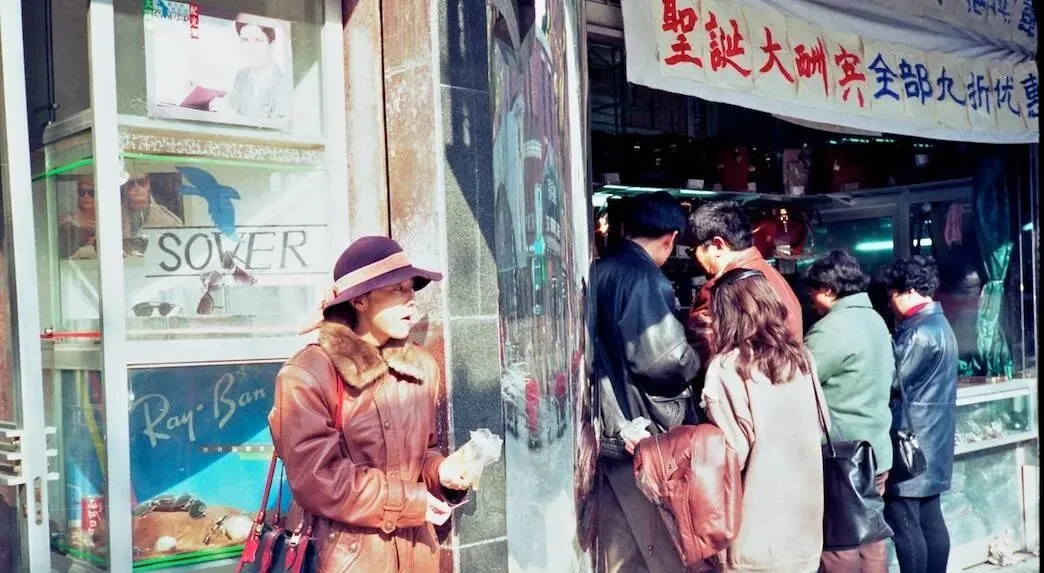 这个白布横幅写着圣诞大酬宾,玻璃橱窗里眼镜牌子摆得洋气,门口排着队,大家攥着票子凑热闹,站在一旁的女士戴呢帽穿皮风衣,手里攥着刚买的点心,爸在旁边嘀咕,九十年代刚开口子,外来花样一多,兜里钱不多心却野了。