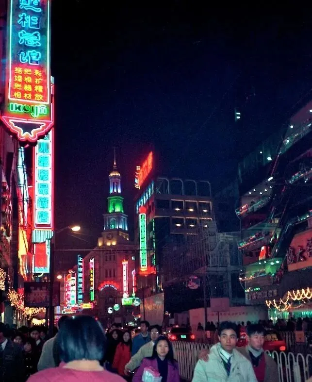 图里那个发绿光的尖塔好醒目,前景霓虹围出一道门,商厦的外廊上人影移动,街心护栏把流动的人潮分成两股,哥哥说那会儿约朋友就说“南京东路门口见”,不用定位,靠的就是眼熟。