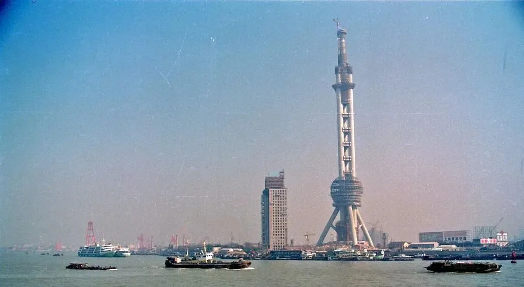 这个高高的钢管塔就是东方明珠,还在爬格子呢,下面的球体脚手架密密匝匝,旁边一艘长拖货船载满石料,舱面一块块垒得齐整,船工站在船尾招手示意靠岸,想想现在的陆家嘴灯一亮赛科幻片,当年真是从零长起来的天际线。