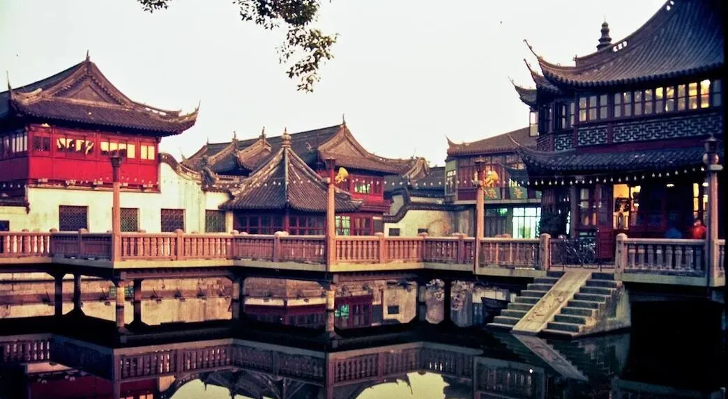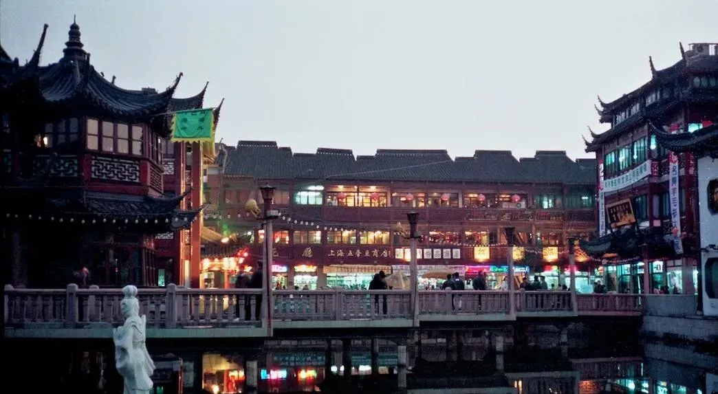 这个木栏杆的折折桥叫九曲桥,桥脚下水清得能照出灯笼的影子,檐角挑起像展翅,红窗格子里透着暖黄的灯,阿姨拎着兜从桥上过,一边走一边说等会儿去买小笼和蟹壳黄,到现在一想起还是那股香味。