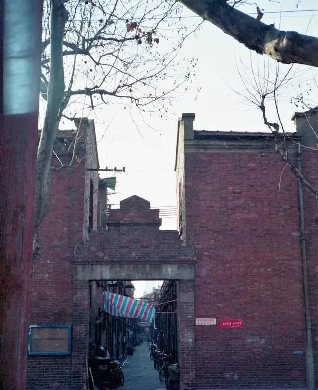 这个红砖门楼叫石库门,门额上留着小弧,进深窄长,里头弄堂像直直的巷筒,绳子拴着条纹塑料布遮雨,墙边靠着旧摩托和脚踏车,外婆指着说我们年轻时就住这式样,一家几代住在一门里,一唤饭开了,全屋子都动起来。