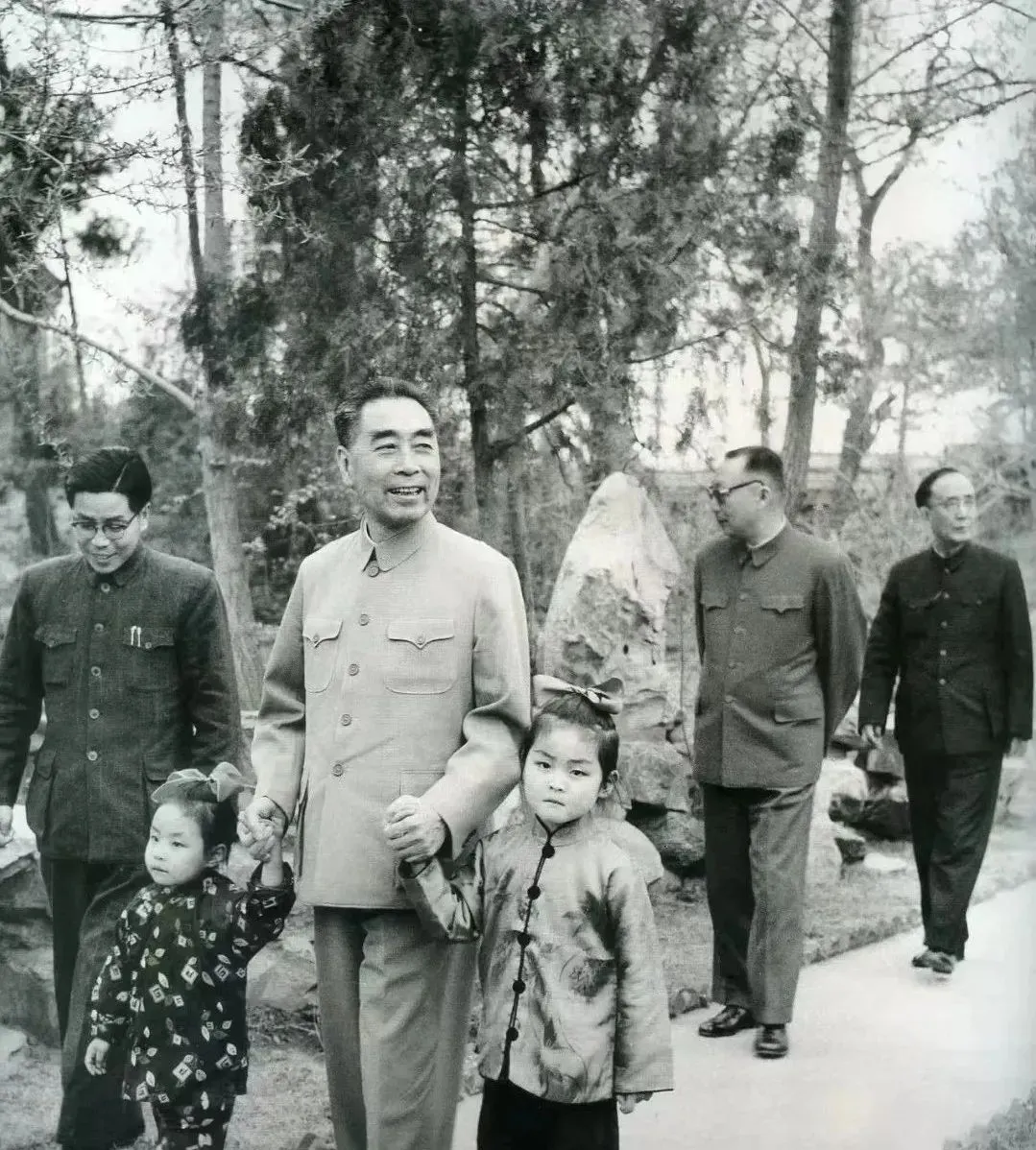 这个画面里的人物站在树影斑驳的小路上,浅色中山装,袖口利落,牵着两个扎着蝴蝶结的小姑娘,小手紧紧勾着大手,石景与松柏在后,风一吹,衣角微扬,笑意是那种能把人群带暖的笑,旁边几位身着深色干部装的同志并肩随行,步子不快,像从会客厅出来透口气,老一辈的从容与家常劲儿就在这张照片里落了地。