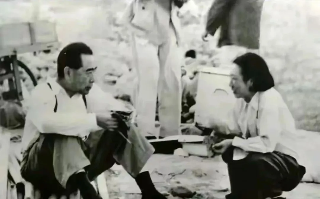 这个场景最打动我,两个人一个蹲着一个席地而坐,裤脚沾了土,旁边是简易木箱与工具包,碗里热气若隐若现,像是野外勘察或在工地上临时歇脚,谈话没摆架子,手一挥一指,都是聊正事的神态,以前下到一线可真不稀奇,来了就坐,渴了就端碗水,不挑地方,把事说透才走。