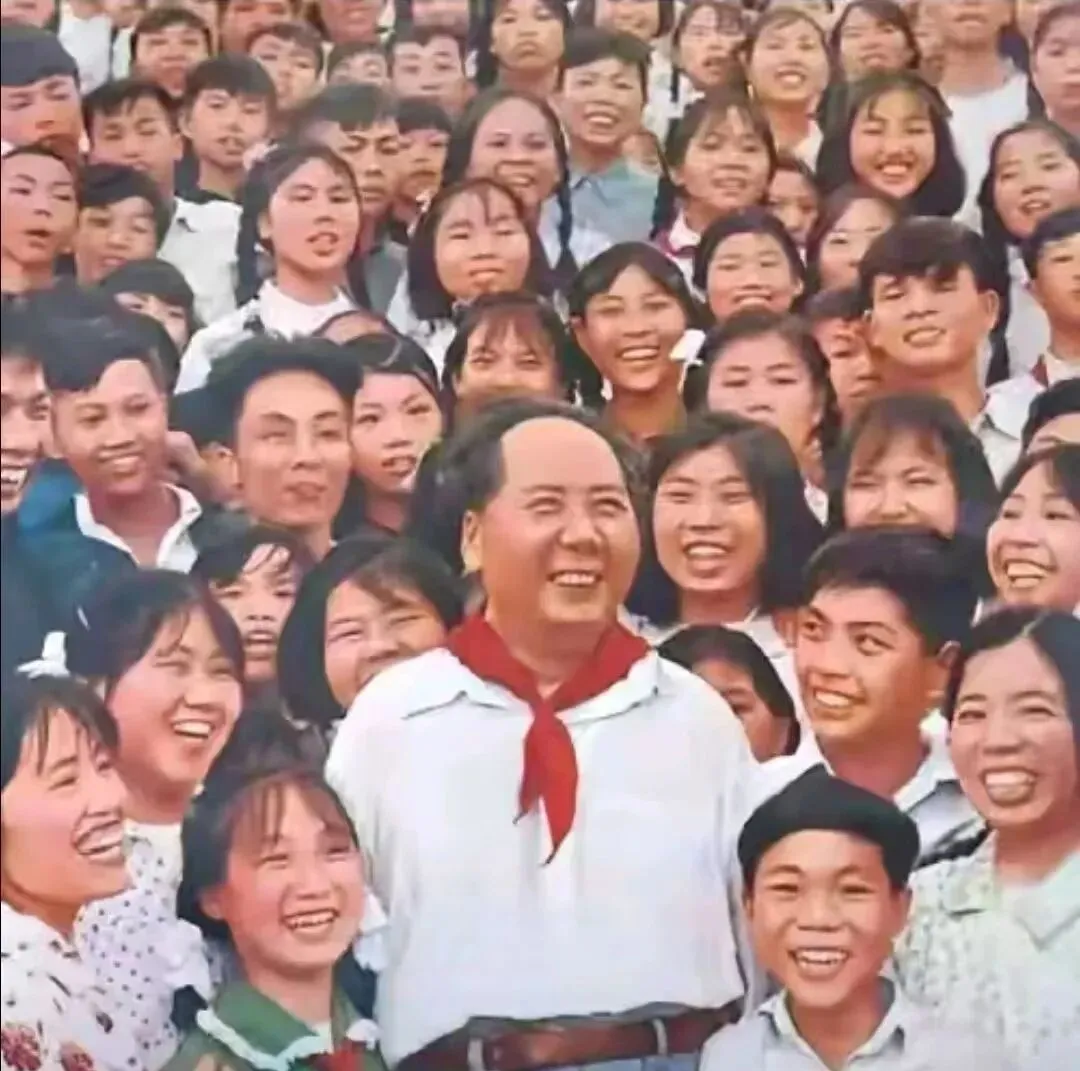 这一张像一阵笑声被定住了,围拢的人群里全是年轻面庞,密密麻麻的笑眼,前排的红领巾红得发亮,阳光把每张脸照得通透,照片一出来就能听到“咔嚓”后那一片欢呼,那时候拍合影讲究“挤一挤都能上镜”,没有高台就借人肩膀垫着站,谁的手臂不小心搭在谁肩上,也不会去拨开,热闹是真热闹。