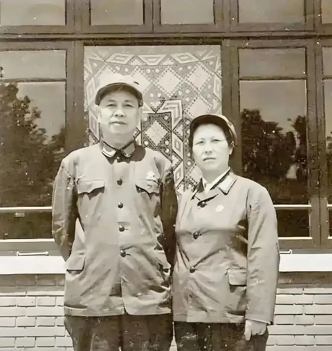 砖墙窗棂做背景,窗上还挂着织得花实的布帘,两人并肩而立,工装扣子泛着旧亮,胸前小徽章一闪,风把衣角吹得起了点褶,神态朴素,像是参加完大会在院里随手一拍,以前拍照少,衣服要抻平,口袋里的笔得摆端正,按下快门那刻,谁也没想过几十年后我们会拿着放大镜看这些细节。