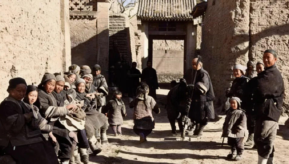 图里这条窄巷子叫村口土街,墙是土坯的,边角上有风化的口子,衣裳多是粗布的灰黑色,帽沿低低压着耳朵,坐在墙脚那排人,手叠着手取暖,说话不急不缓,孩子在巷子里打着趟,太阳照在地上是明晃晃的,一对人抻着脖子往镜头瞧,像谁在悄悄问一句你看那边儿在干啥呢,冬天里没什么事,晒着背,听一耳朵远处摊贩的吆喝,家里炕上还正冒着热气,娘说别跑远了,天转凉就回家,巷口的门楼影子压过来一块,风一过,衣襟轻轻晃一下。
