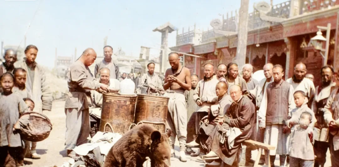 这张热气腾腾的叫江湖把式耍狗熊,领熊的人赤着胳膊,手里一根细绳勒在掌心,地上有一片撕开的纸糊做的垫子,旁边两只大铜桶当鼓敲,咚咚点子一响,熊努着头慢慢转圈,嘴上似乎还有束缚,围着的人七嘴八舌,孩子拎着小篮子挤在人堆缝里,想看个仔细又不敢太靠前,外衣袖口磨得发亮,街上尘土被脚跟轻轻扬起来,我外公说这门行当吃力还不落人情,讨口饭得看天色也看人心,给钱的图个吉利,没给的图个热闹,转到尽头,艺人抱拳一作揖,扯着嗓门喊一句诸位赏个脸,铜钱哗啦落在盆里,响得脆生生的,现在去动物园看是另外一码事了,那时候的见识就系在这根绳子上。