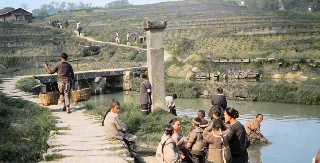 这个地方叫河滩石板路,整块整块的青石边沿拾级而下,桥洞低低伏着水面,石桥一头连接梯田,一头搭在村道,柱子立在路边不知做何用,女人们挽起袖子,把衣裳按在水里一压一搓,唠嗑一句接一句,水声和笑声搅在一块,男人挑着扁担从桥上过,两个筐子空空的,回头得装满菜叶柴根,小时候我坐在石坎上晃腿,娘递给我一个干馍说别沾水,等太阳偏西一点,衣服拧干甩两下搭在竹竿上,风从田畔过来,稻草味和泥腥味糅成一股子熟悉,奶奶说以前就靠这条河,洗衣取水全在这儿,现在家家扭开龙头就有,手上倒是干净了,可这河边的热闹声也跟着淡了。