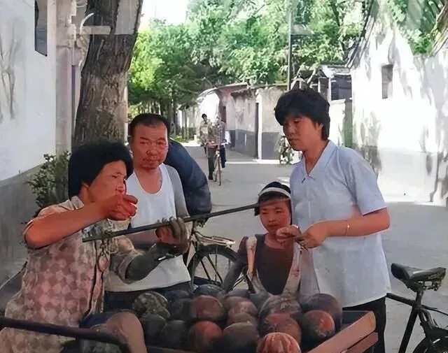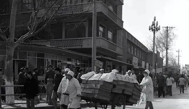 这张街景是北大街的热闹劲,白帽子的师傅推着平板车,车上码着木箱,街沿挤满看热闹的人,玻璃柜里摆着搪瓷盆和小收音机,有人伸手比划价码,买不买先握一握,笑一笑,过去逛街讲究挤里挤外转两圈,现在扫个码就付了,热闹却还是喜欢这种人挨人的温度。