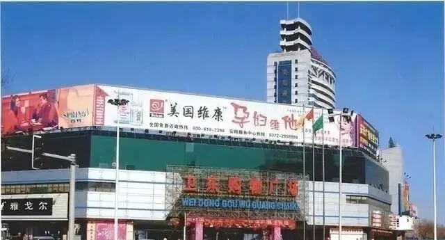 这块写着卫东购物广场的,外墙一半是招牌一半是玻璃,楼顶还有层层叠起的塔样子,九十年代谁提着塑料编织袋去里头扫货,都觉得自己走在前面,现在回看那张蓝天底的招牌,还是挺精神。