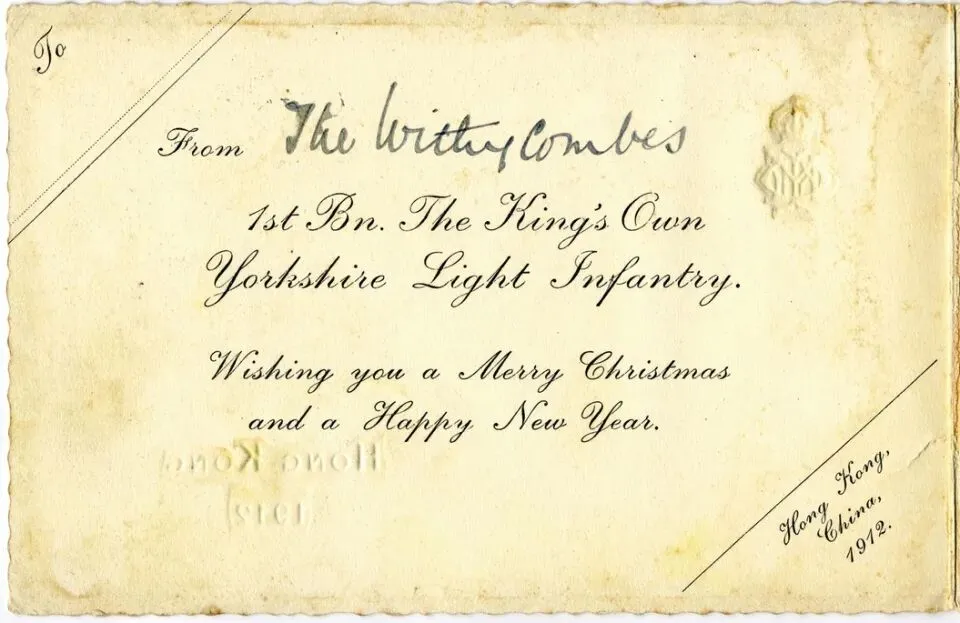 打開聖誕卡會見到一段文字「The Withycombes,皇家約克郡輕步兵團第一營」(The Withycombes, 1st Battalion, The King’s Own Yorkshire Light Infantry),接着就是這兩幅照片。