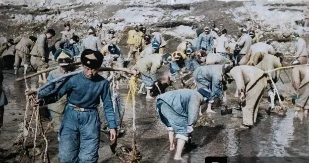 这满地的竹筐和铁镐是修路家伙什,冻土剁不开,就先浇一遍温水,再一锄头一锄头掀起来,肩上的扁担压得人直打趔趄,队伍里有人哼两句小调,一下子就有了劲头。