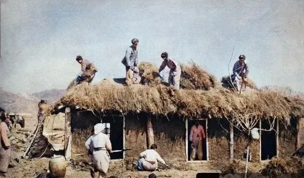 这片金黄的顶子叫茅草屋顶,男人们在上头铺草,女人们在下面捆扎,屋檐边挂着水壶和木瓢,孩子探出头看热闹,奶奶说,这屋子挡风,雪下再大也不漏。