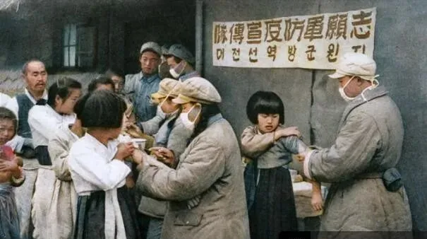 这根细细的银针叫防疫针,袖子一挽,胳膊一紧,孩子眼圈一红还憋着不哭,医务兵戴着口罩,手上不停,边安慰边操作,墙上挂着标语,意思就一条,保住乡亲们的身子骨。