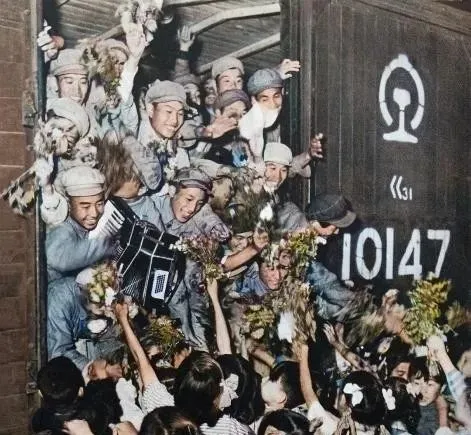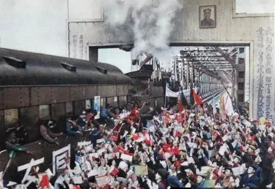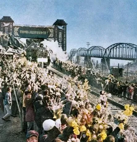 图中这阵仗叫欢送志愿军的队伍,横幅一扯鼓一敲,火车一进站就沸腾了,白衬衫的学生往前挤,手里攥着纸花和小红旗,谁都想把祝福递到车窗边,那会儿不讲仪式感这个词,可这阵势,比现在任何仪式都更真。