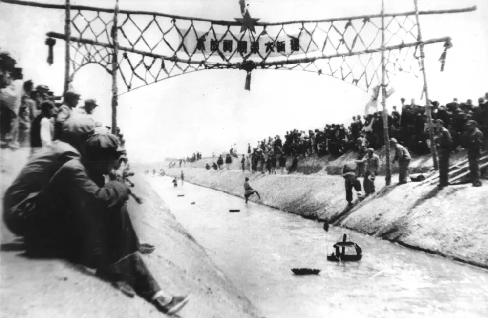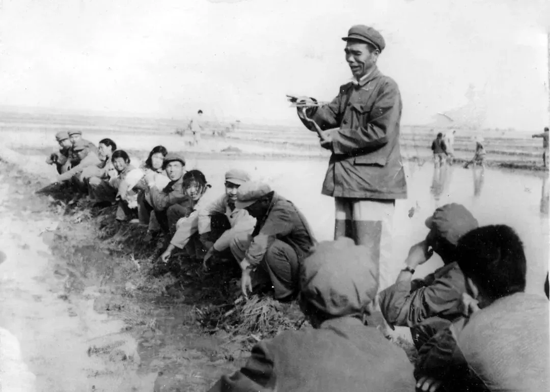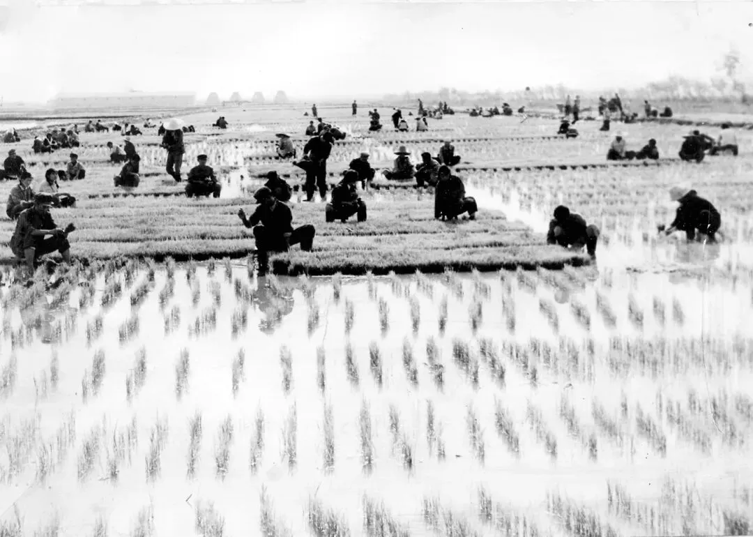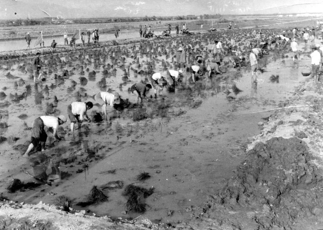 △20世纪70年代,团场职工在水稻田中举行人工插秧劳动竞赛。