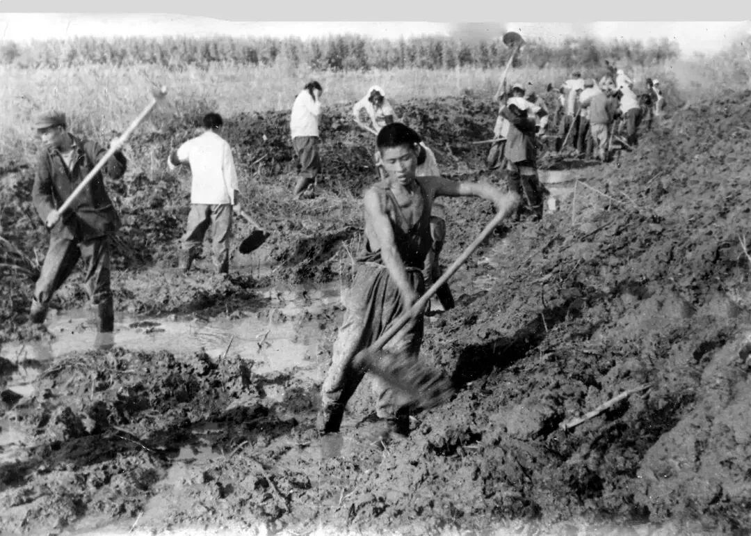 △1965年,解放五场(现二十四团)职工在野外开荒造田。