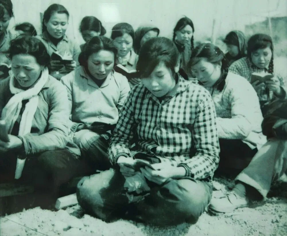 △20世纪60年代,团场女职工利用劳动间歇学习文化知识。