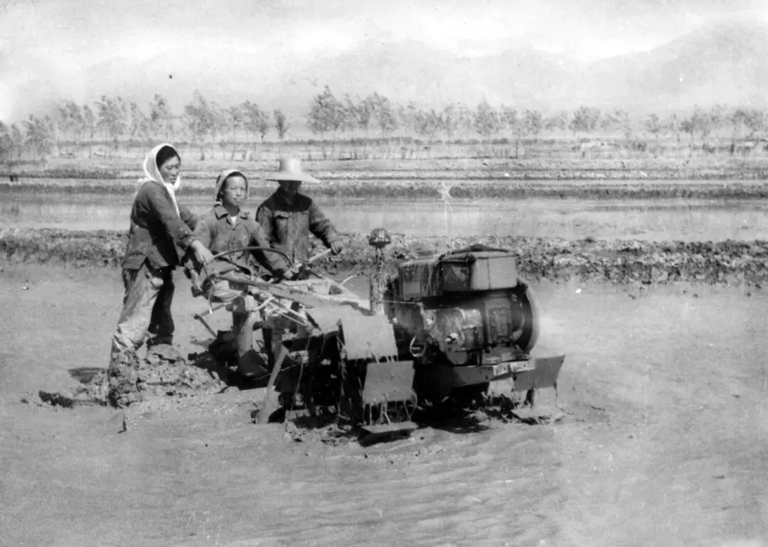 △20世纪80年代,团场用手扶拖拉机平整稻田。