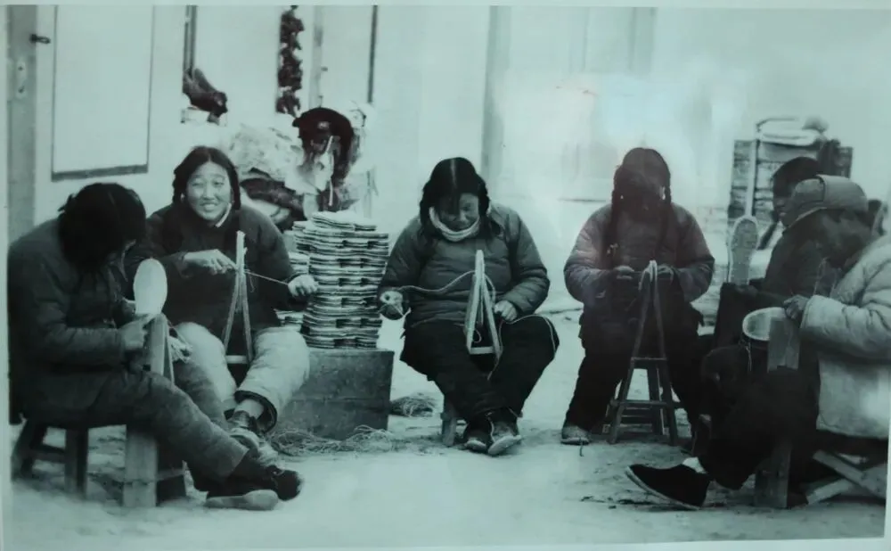 △在艰苦岁月,团场女职工手工缝制布鞋。