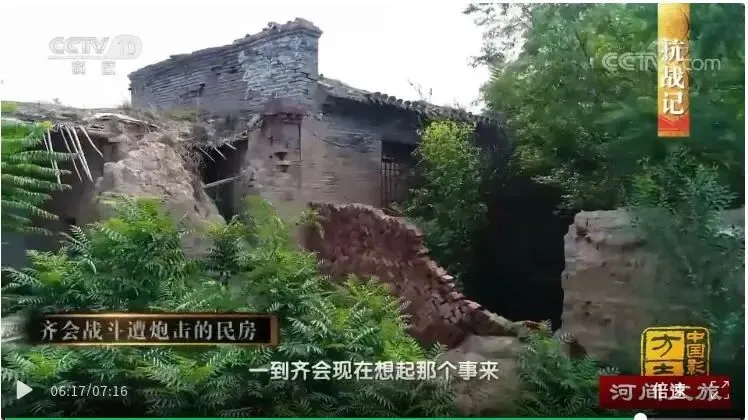 这是齐会战斗中遭炮击的民房。村民们回忆说,那年是三月初四,太阳刚刚出来的时候,敌人来了三架飞机,100多辆车,他(指日军)一打炮,就打的过梁炮,咱们西边有个碾子,有一间房,全给打塌了。